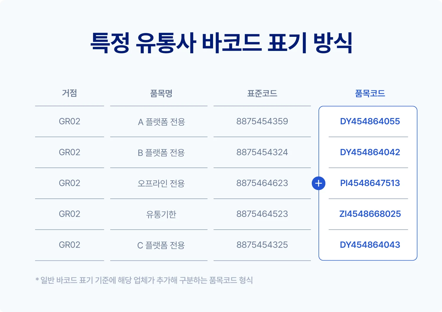 해당 플랫폼은 상품의 종류가 같더라도 수량이 다르면 표준코드를 별도로 발급합니다. 그리고 물류를 처리할 때 표준코드를 기준으로 진행해 상품을 납품할 때 같은 상품이더라도 수량이 달라 표준코드가 다르게 부여되면, 한 팔레트 안에 합배송을 하는 것이 아닌 상품 표준코드는 같지만 다른 상품과 함께 별도의 팔레트로 납품해야 합니다.