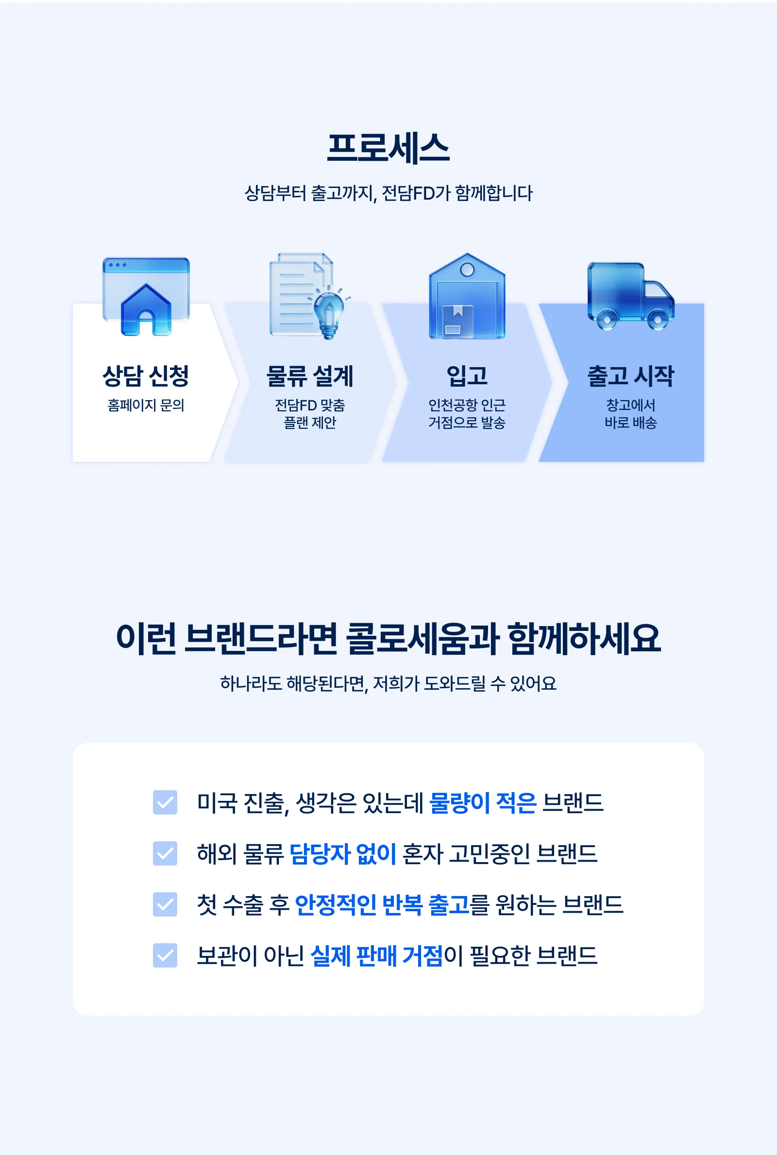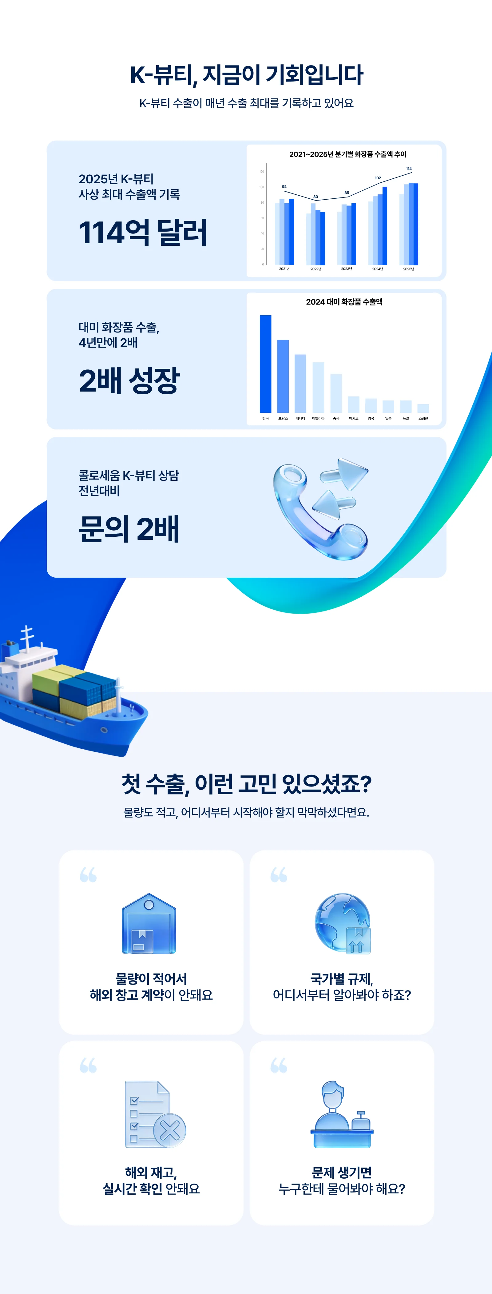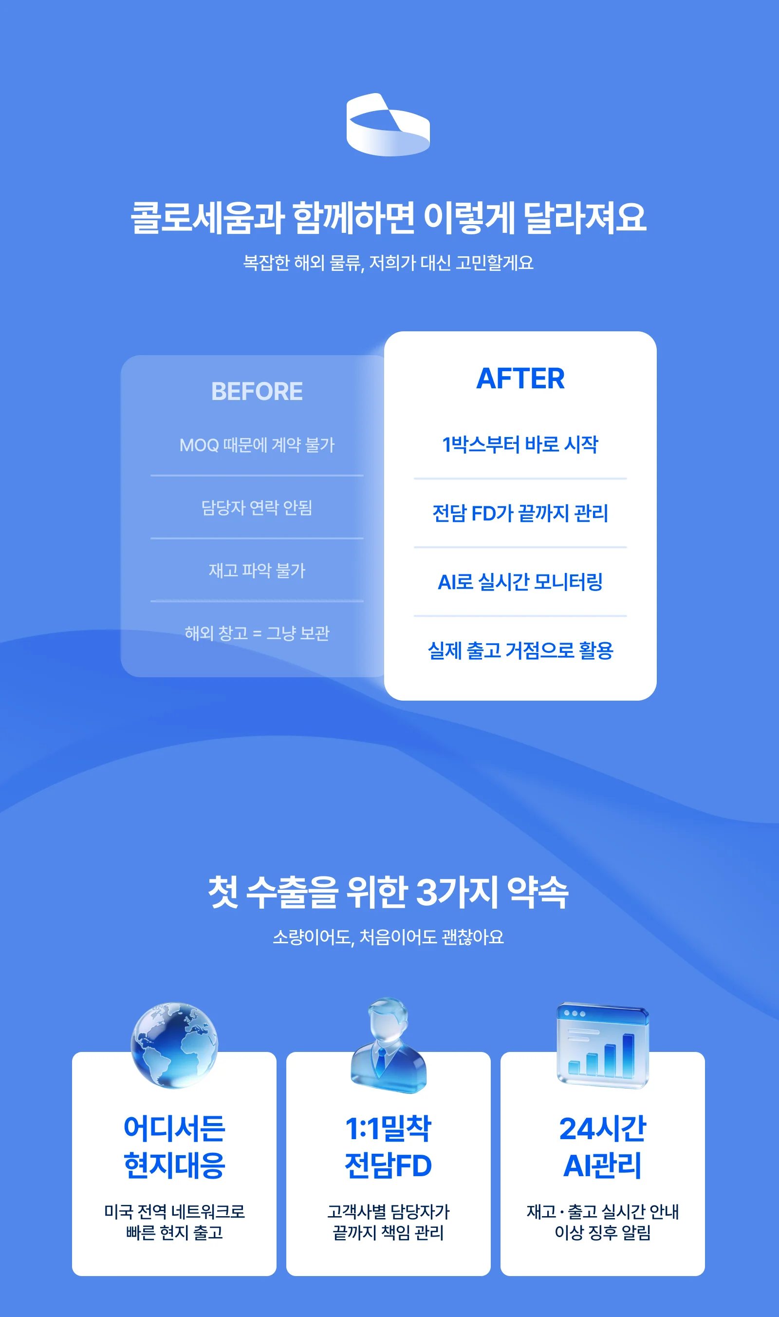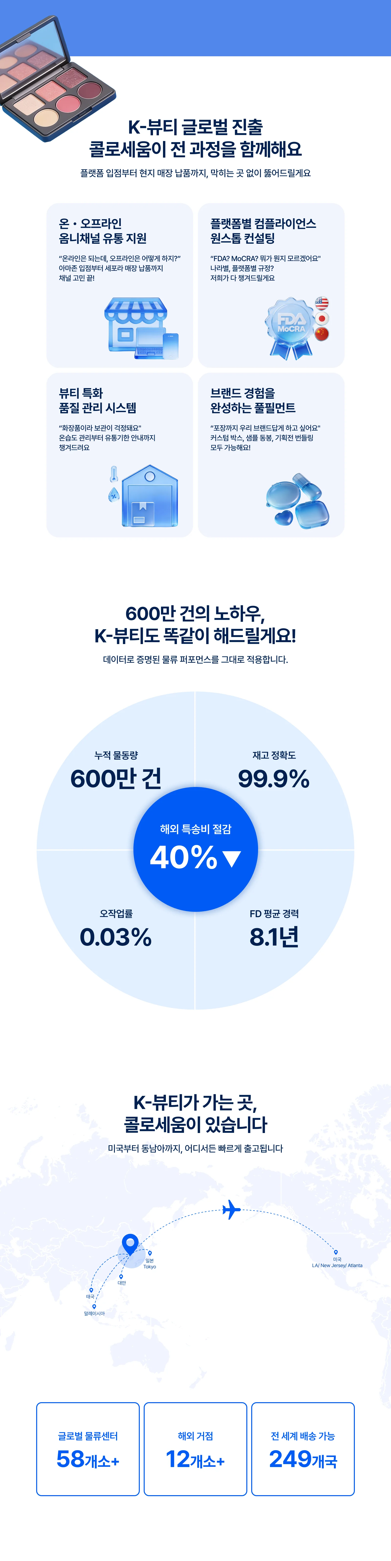 최소 물량 때문에 해외 물류 포기하셨나요? 콜로세움 첫 수출 지원은 MOQ 제한 없음. LA·뉴저지·아틀란타 현지 출고로 K뷰티 미국 진출 시작하세요.